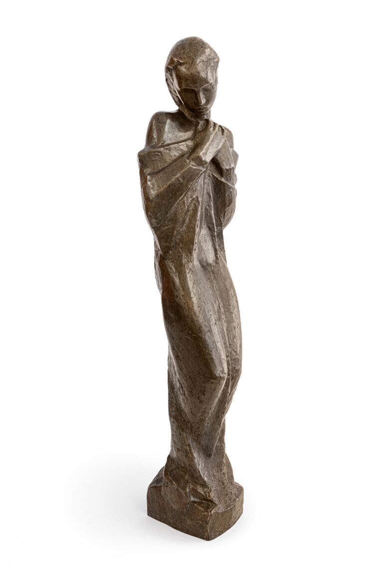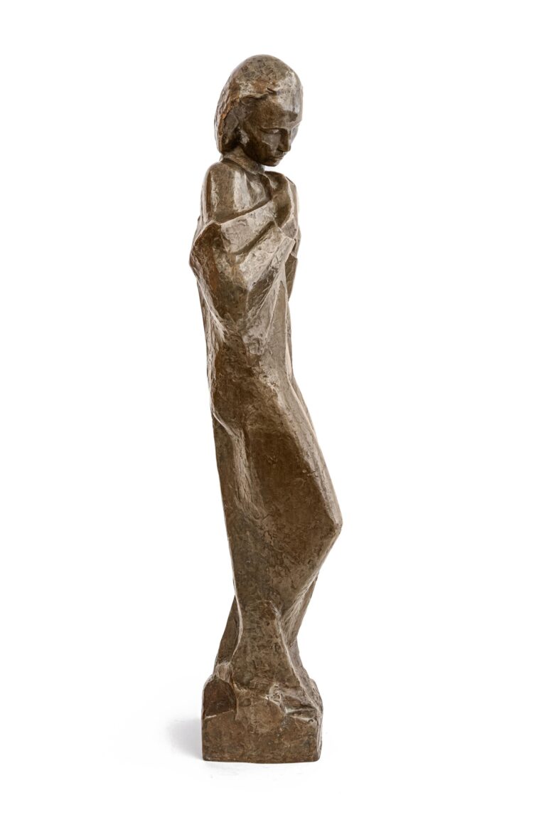 The woman depicted reverently tilts her head slightly to one side. Her mouth and eyes are closed, and the hair is neatly combed back. The folded hands rest on her chest. The slender, tall body stands slightly bent on the plinth, whereby her legs show through the draped robe. This contrasts with the angular drapery of the scarf, which is thrown loosely over her shoulders and held in place by the woman’s arms. The woman appears peaceful and introverted, completely absorbed in her thoughts. Although she is depicted without any religious attributes, it almost seems as if we are standing in front of a saint