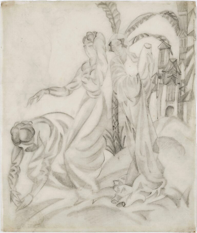 August Macke understood drawing not only as an exercise or for preparatory study, but rather as an independent means of artistic expression. In his drawings he captured everyday scenes and elaborated things he had seen into virtuoso compositions. The second is also the case in the drawing “The Three Women”. The long robes, the partial veiling, the clay pot that one of the women is carrying, as well as the palm tree and the striking architecture, all indicate that Macke is depicting a scene set in the Orient. In 1913 Macke’s trip to Tunisia was still ahead of him, so it can be assumed that this drawing is not an image of a real-life model. However, Macke’s great interest in the Orient is evidenced by numerous other drawings that find their way into his oeuvre, especially from the time of his visit to an ethnological exhibition on Oriental culture in 1910. The drawing also shows Macke’s involvement with the art of early Cubism. The ruffles of the women’s garments seem almost deconstructed, as we know, for example, from Robert Delaunay’s window series, with whom Macke was personally acquainted. However, Macke finds his own style here. The soft pencil used does not make the dissected garments appear angular, as would be typical of cubist art, but allows them to flow across the paper like cascades.