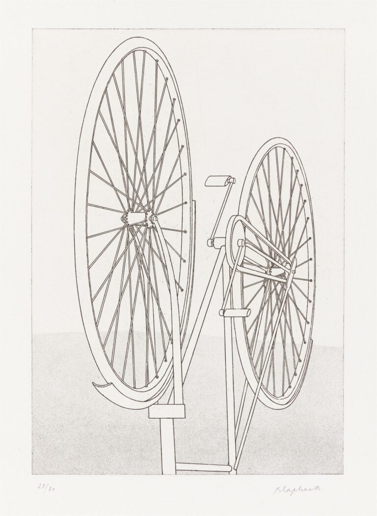 Klapheck found the upside-down bicycle in a Kaufhof newspaper ad. “I kept the newspaper page for almost ten years before I felt up to the task,” says Klapheck. The bicycle was completely redesigned, not something projected, and the wheels with their 36 spokes proved particularly difficult. “After all, it not only has to look somewhat believable technically, it also has to be artistically right.” Klapheck had seen the Tour de France supply wagons in France with their spare bikes on the roof. The inverted wheel appears as an instrument of torture and stands for the maltreated winner.