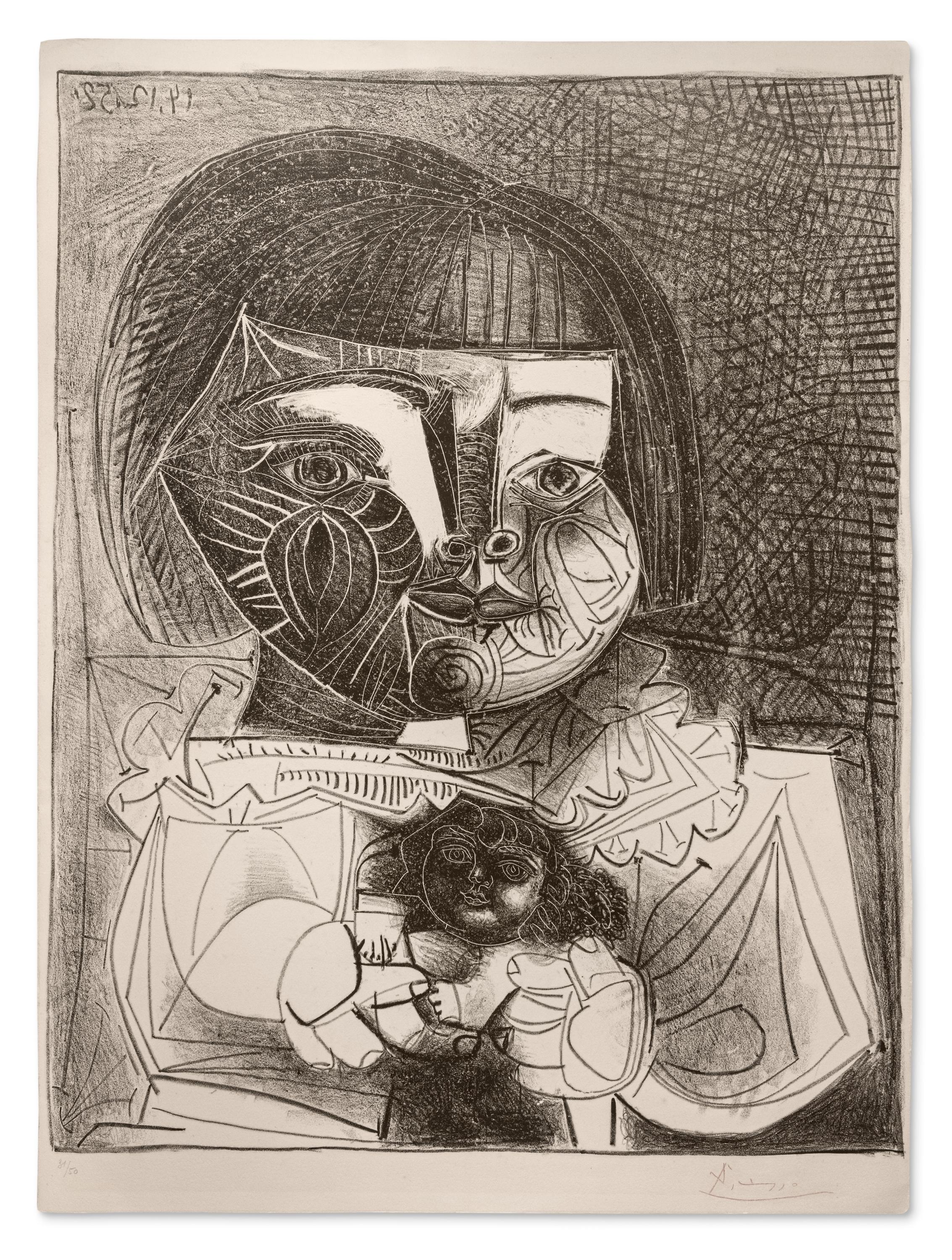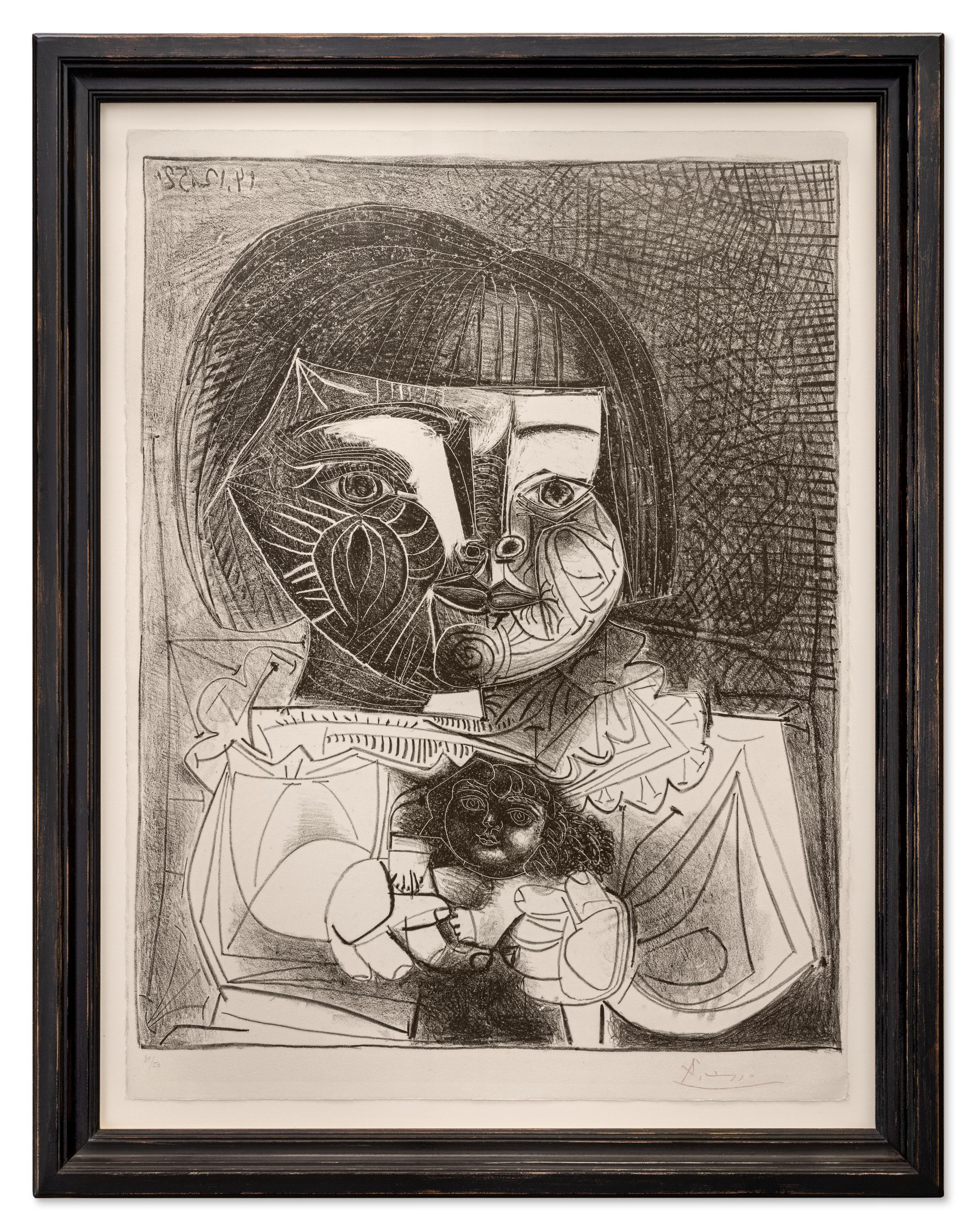 With the lithograph ‘Paloma et sa Poupée sur Fond noir’ from 1952, Pablo Picasso allows a rare, intimate insight into his family environment: at the centre of the composition is Paloma Picasso, his youngest daughter, depicted in a peaceful moment of play with her doll. In the midst of the artist’s often experimental, political, or erotic oeuvre, this depiction stands out for its tender emotionality and personal closeness.