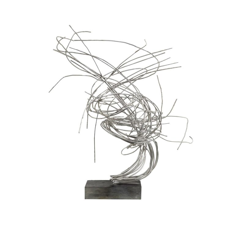 The same goes for the spatial sculpture created around 1955. Although tightly twisted and curved within themselves, the metal rods extend into their surroundings almost like wings, suggesting a unique openness that can hardly be found in any other sculptor’s work. The entire energy radiates into the surrounding space and sets it into rhythmic vibration. Form, dynamics, space and time merge into masterfully placed and constantly changing expansions in space, whereby the sculpture dematerialises itself.