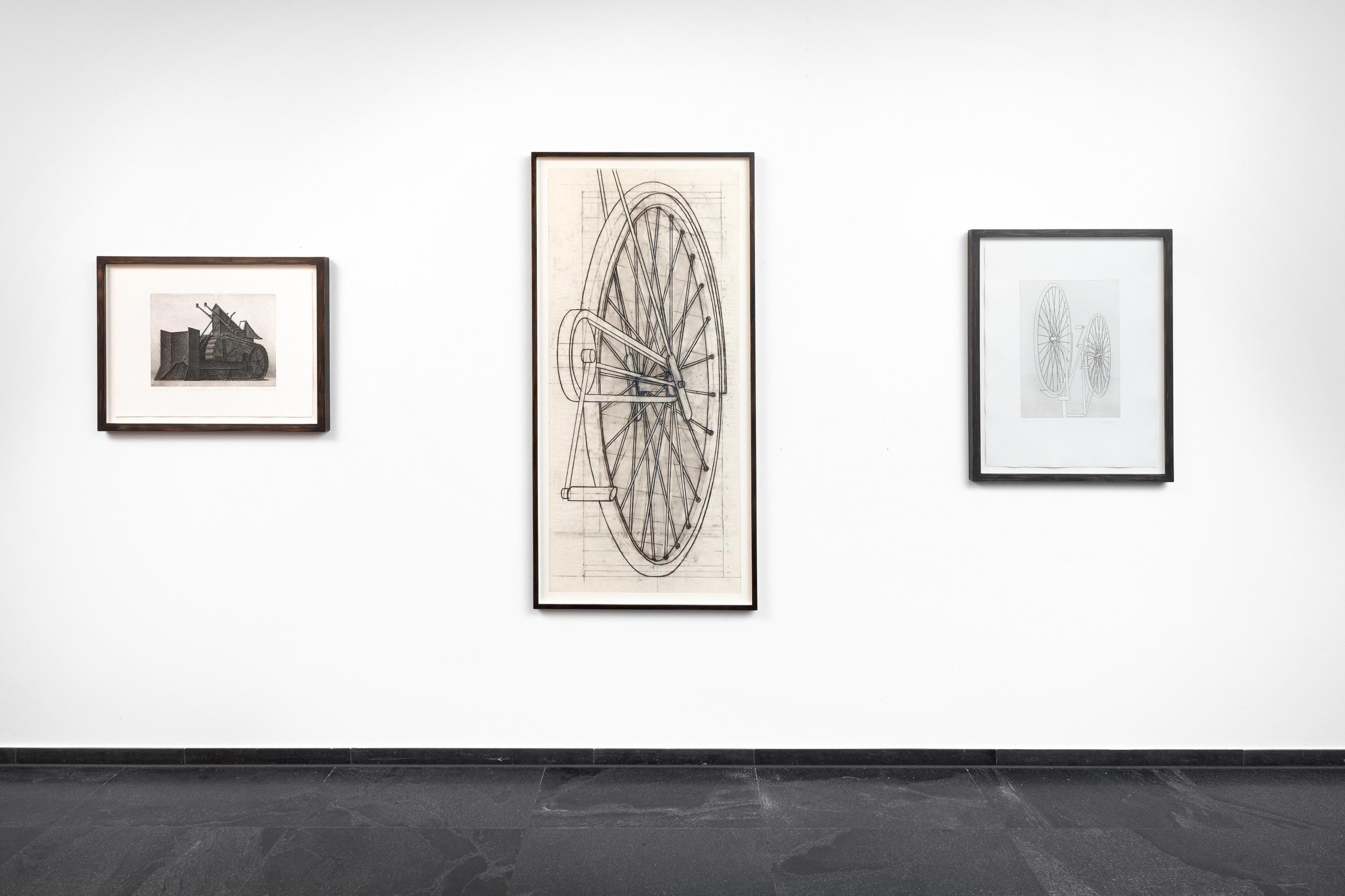 Klapheck found the upside-down bicycle in a Kaufhof newspaper ad. “I kept the newspaper page for almost ten years before I felt up to the task,” says Klapheck. The bicycle was completely redesigned, not something projected, and the wheels with their 36 spokes proved particularly difficult. “After all, it not only has to look somewhat believable technically, it also has to be artistically right.” Klapheck had seen the Tour de France supply wagons in France with their spare bikes on the roof. The inverted wheel appears as an instrument of torture and stands for the maltreated winner.