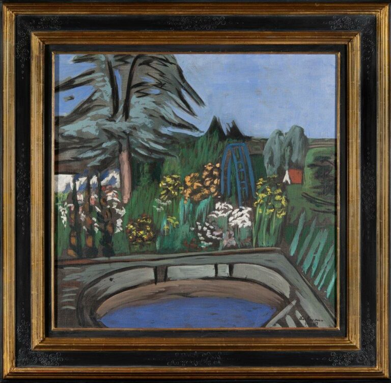 Max Beckmanns Blühender Garten aus dem Jahr 1933 zeigt einen Garten voller Energie – als wäre er in einem Moment der Ruhe vor einem Sommergewitter gemalt worden. Beckmanns kraftvolle Pinselstriche erregen unsere Aufmerksamkeit mit schwarzen Umrissen, scheinbar bebenden Blumen und einem stillen, massiv im Vordergrund ruhenden Schwimmbecken.