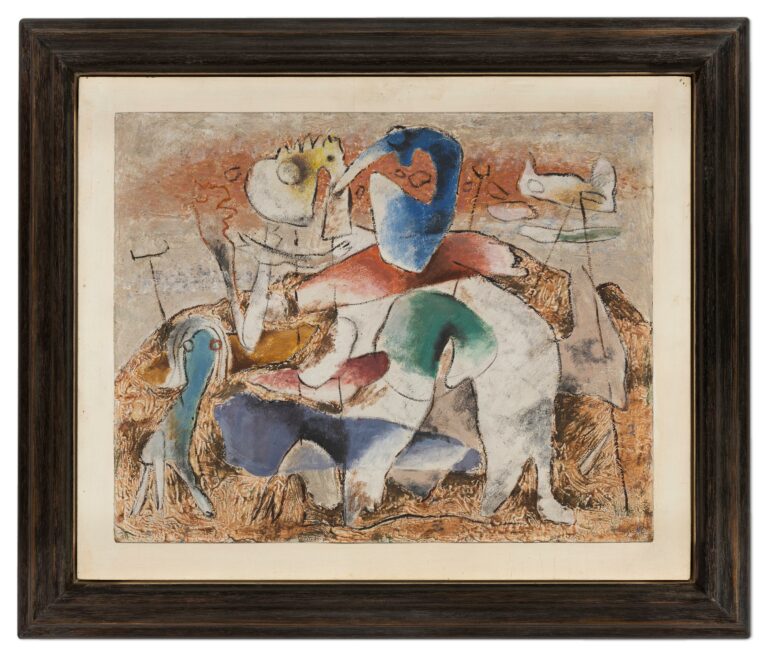 „(…) So entdeckt Baumeister 1938 die schon 20 Jahre früher vom Russen Malevitch gemalten fliegenden Formen. Aus seinen Figuren werden tropfen- und nierenförmige Ideogramme. Und hier setzt seine 2. Periode ein, die der reifen Meisterschaft, in der Baumeister seine Unabhängigkeit, seinen einmaligen unverwechselbaren Malstil findet. Die große und entscheidende Wandlung trifft zusammen mit dem Beginn seiner fast 7 Jahre währenden Tätigkeit in Wuppertal. (…) Abgeschlossen von der Kunstproduktion der Umwelt, auch des Auslandes, entstehen hier nun Baumeister’s völlig eigene und selbständig inspirierte Werke. Am Anfang stehen die Bilder Urpflanzenreich und Urtierreich. Weitere Anregungen geben die Felszeichnungen der Steinzeit. (…) Die Kunst der Naturvölker kommt hinzu. Dann folgen früh-babylonische, ägyptische und griechisch-archaische Elemente und Ostasien. Dazu kommt das Studium der Stoffbildung und der Modulation.(…)