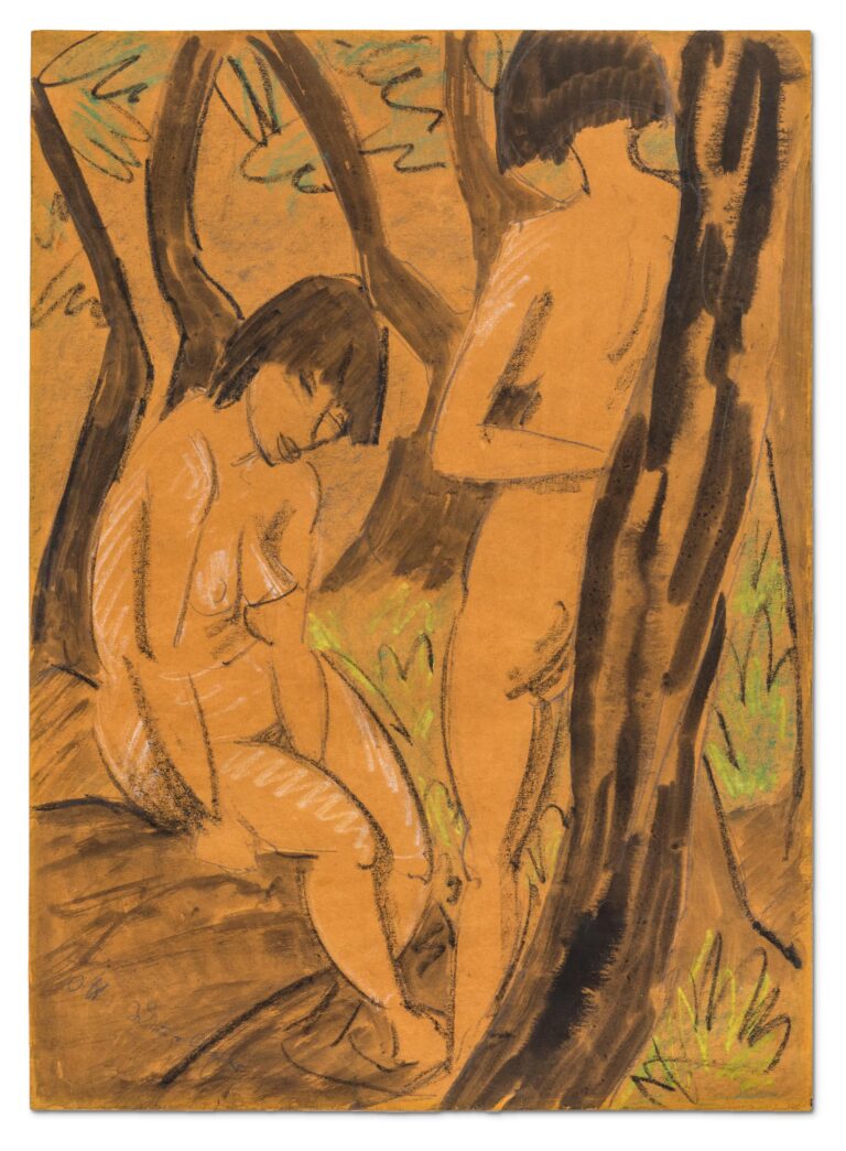 Völlig in seiner persönlichen Bildsprache aufgegangen, zeichnet Otto Mueller die Figuren markant und leicht eckig. Zugleich erscheinen die Konturen weich und fließend. Trotz der klaren Linienführung wirken die beiden Frauen nicht isoliert, sondern harmonisch in die Natürlichkeit des Waldes eingebunden.